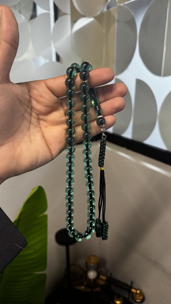 سبحة بكلايت أسود شفاف كركوشة بني تجمع بين فخامة اللون ودفء التفاصيل. اللون الأسود الشفاف يعطيها عمق وهيبة، ومع الإضاءة تظهر لمعة أنيقة تزيدها جاذبية، بينما الكركوشة البنية تضيف تباين جميل ولمسة تراثية دافئة تكمل الشكل العام.